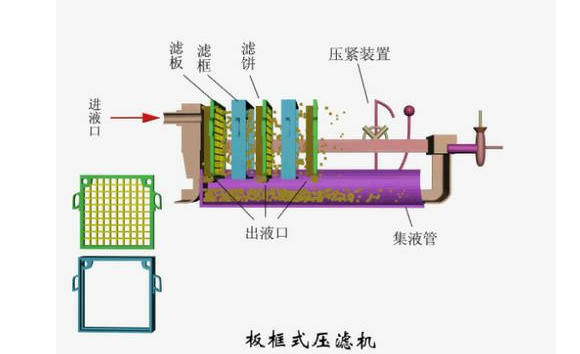 上圖是板框式壓濾機結(jié)構(gòu)圖,如圖我們所示,料液從上方進(jìn)入,流入濾框,一個濾框有兩個濾板,料液通過兩個濾板后,濾餅留著兩個濾板夾著的濾框內(nèi),濾液從下方的出液管出去。